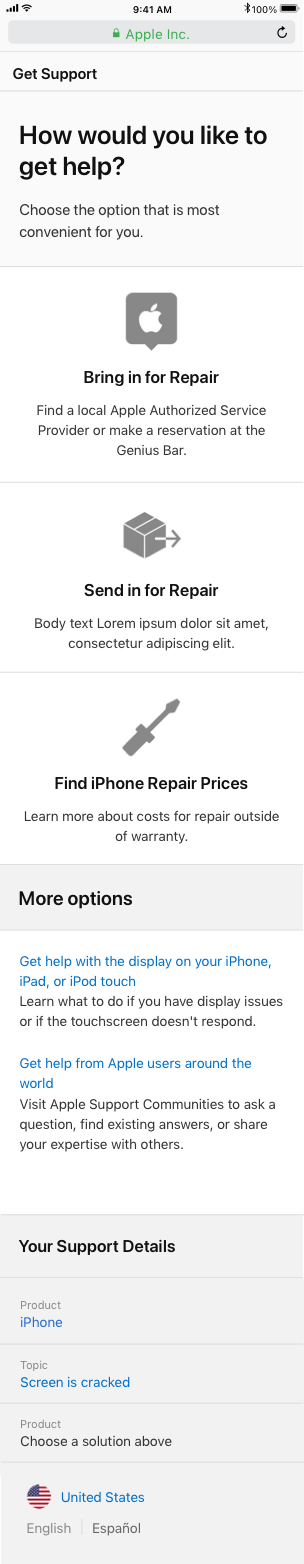 In the beginning, there was no design system in place. I worked with the Online Support creative director to identify suitable patterns and visual styles across apple.com that could be adapted.