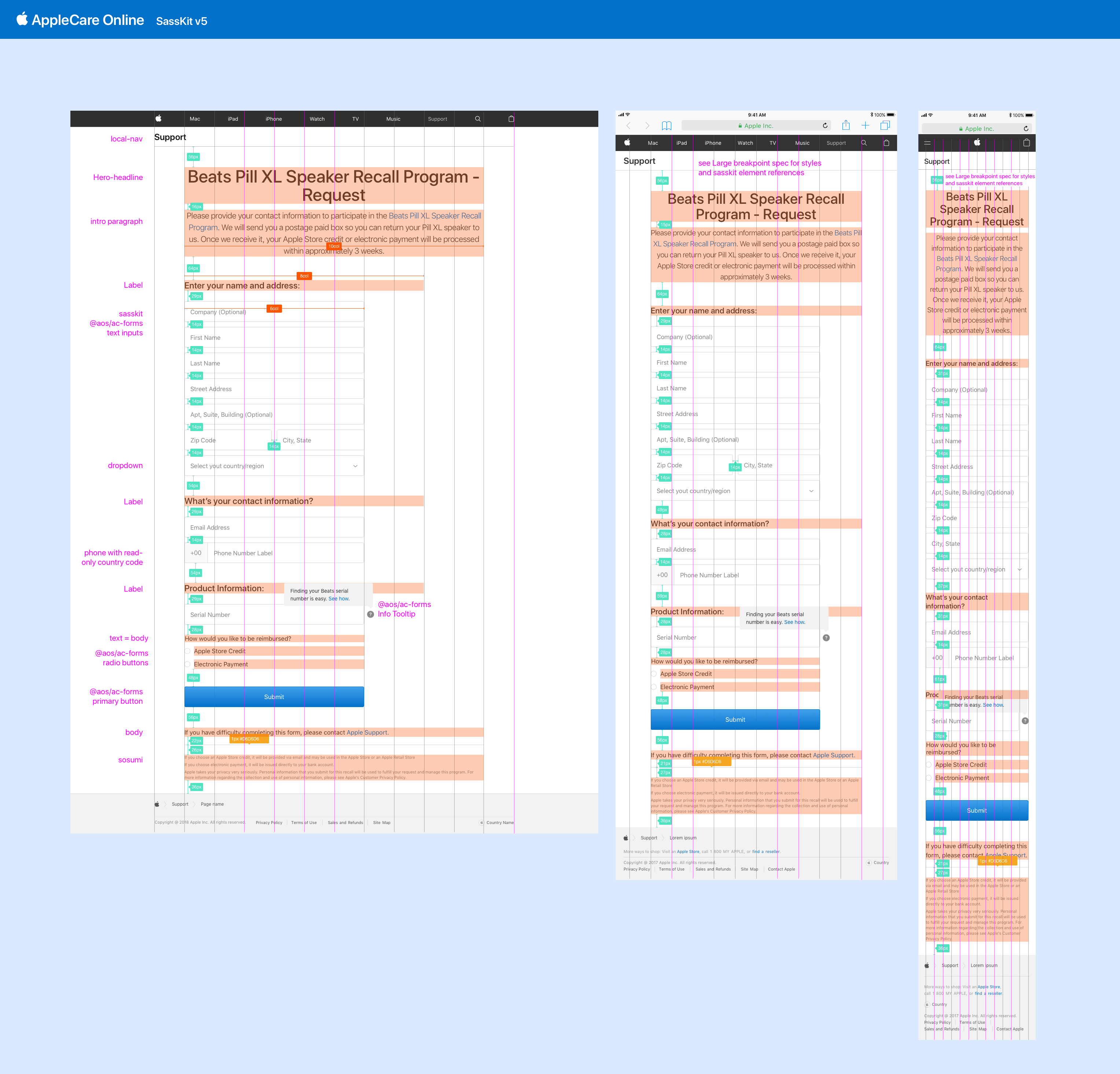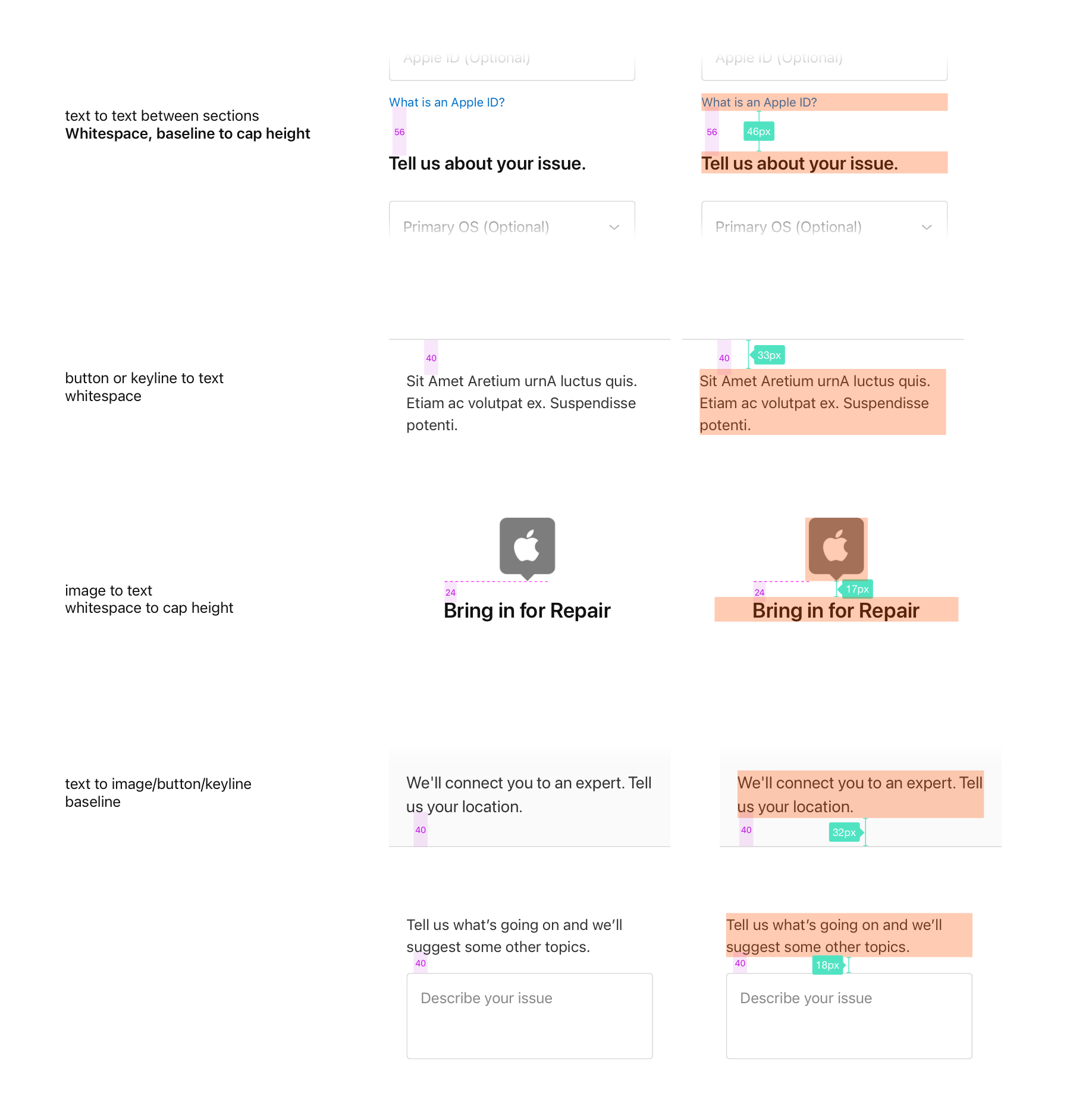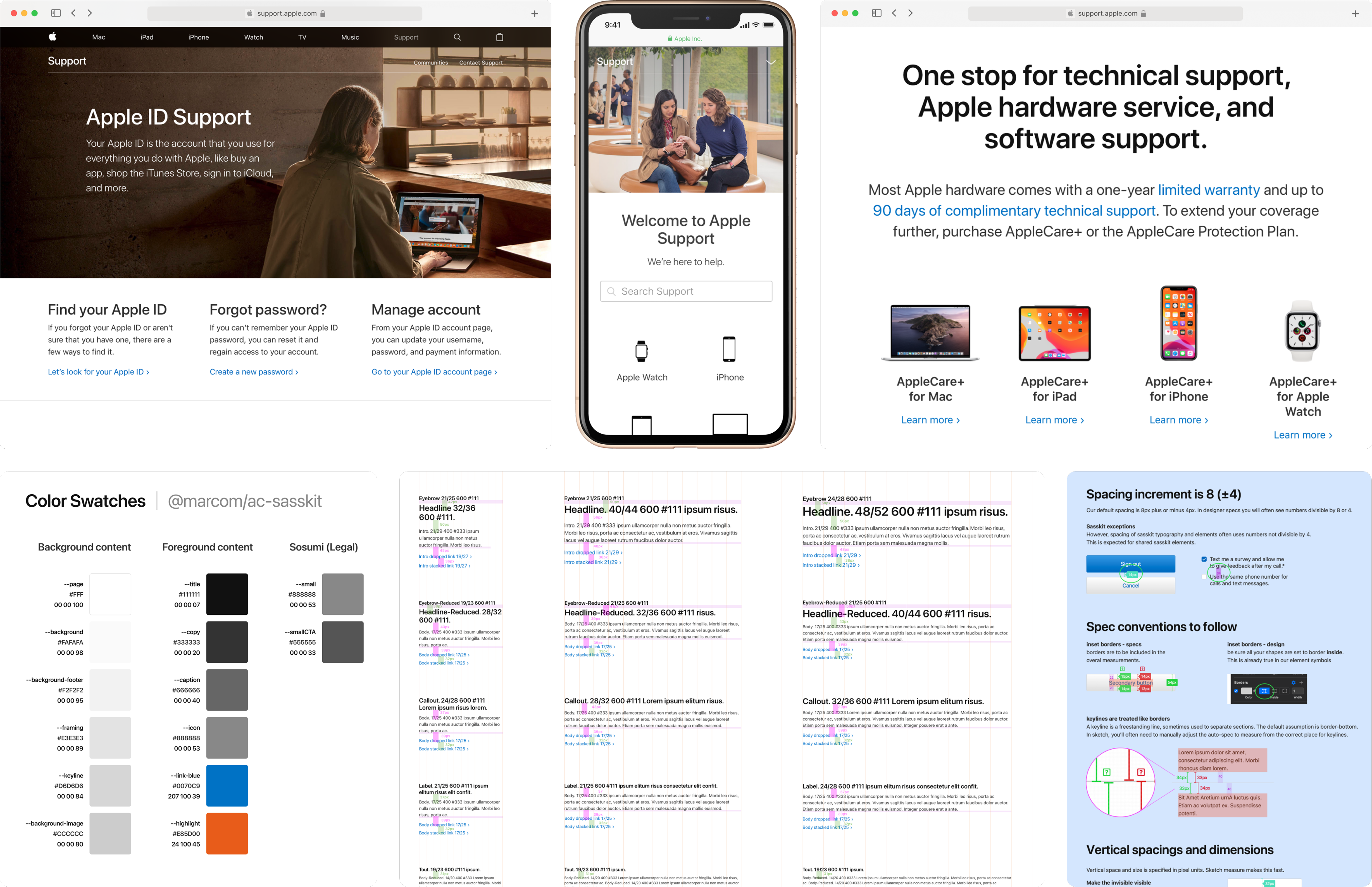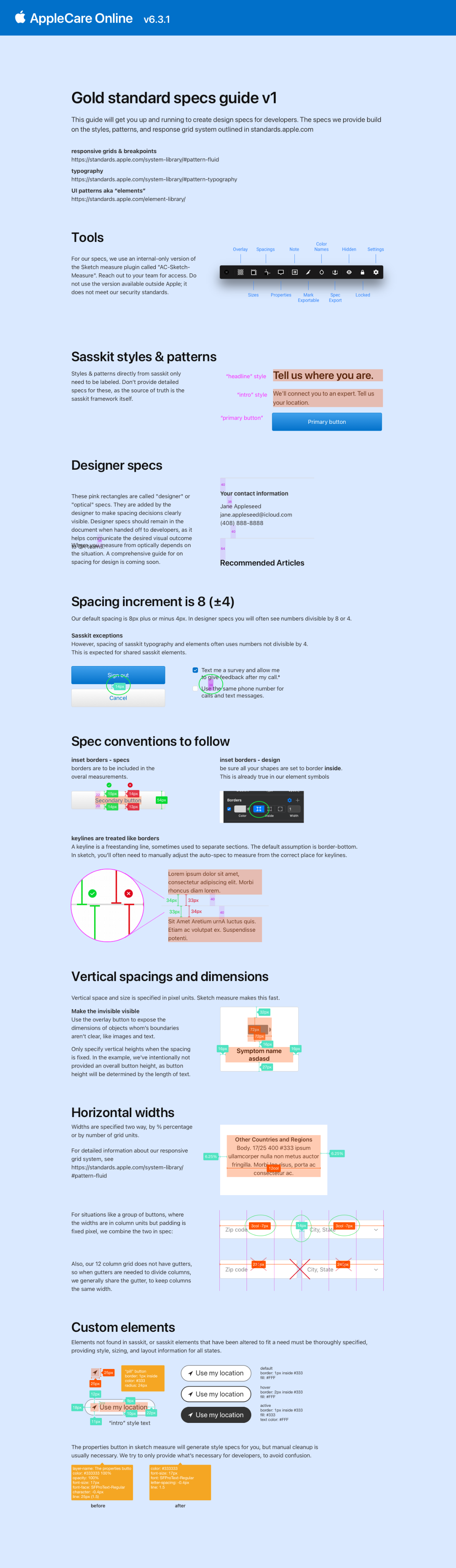Reference docs with guidance for our Support use cases. My goal was to standardize how we spaced and spec’d mockups, so engineering could confidently begin to use shared components across AppleCare projects.