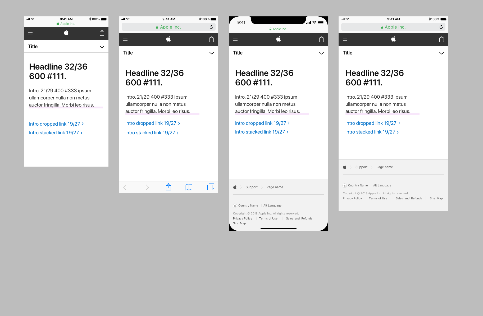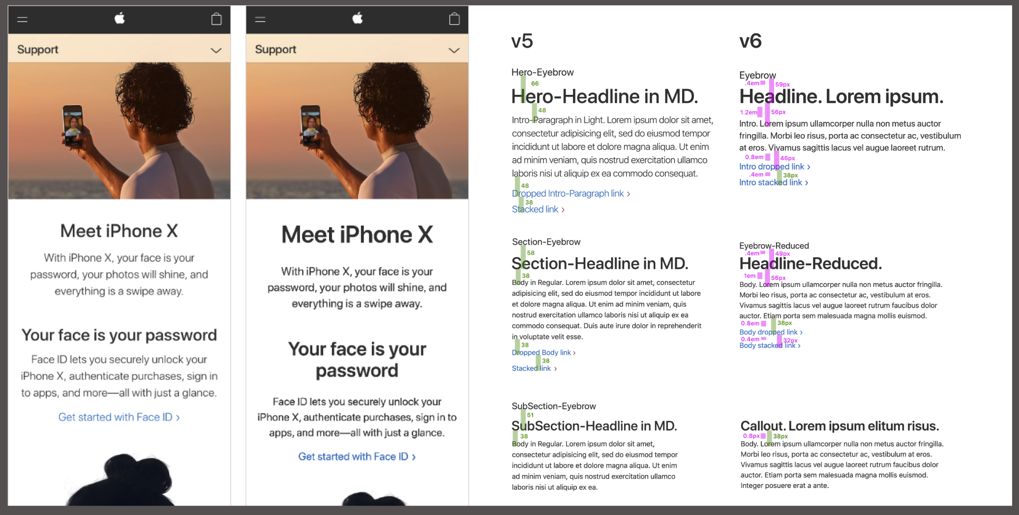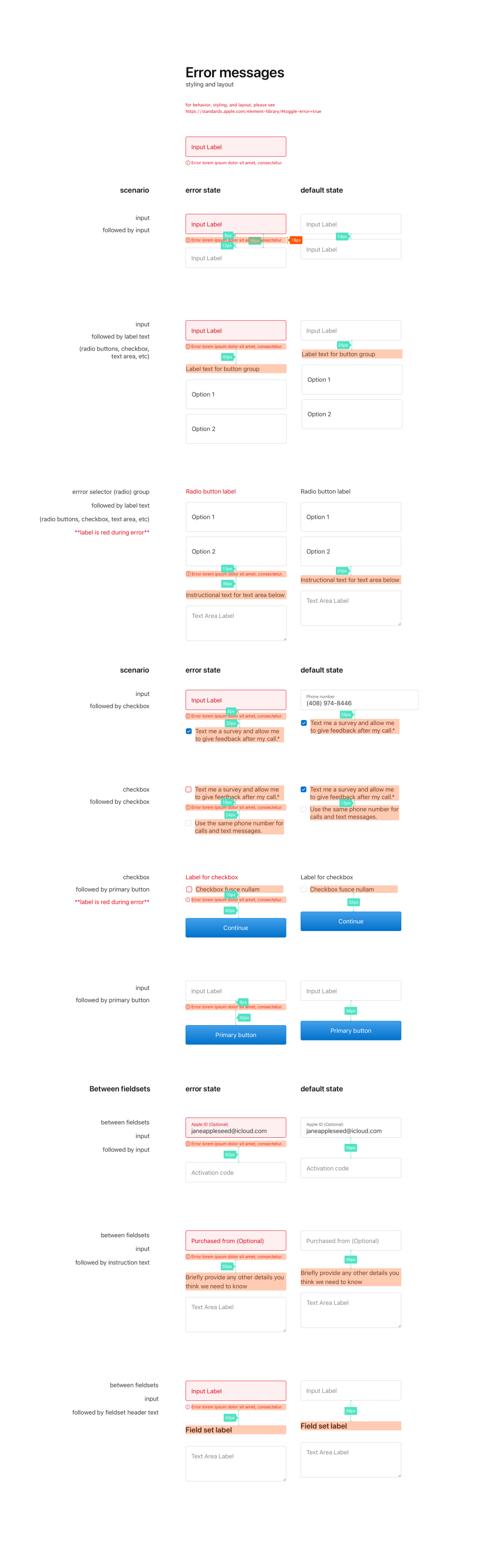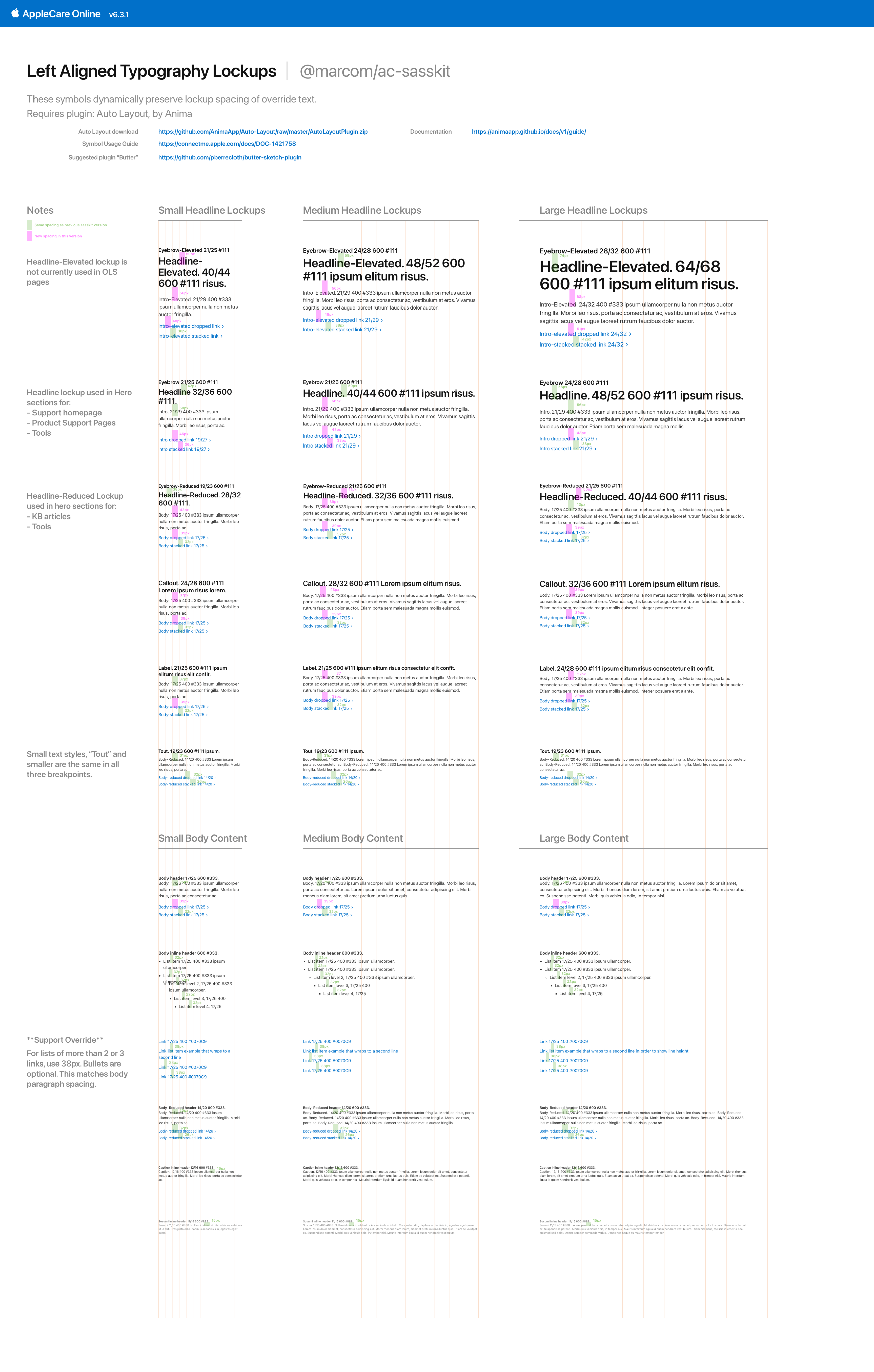 Reference docs with guidance for our Support use cases. My goal was to standardize how we spaced and spec’d mockups, so engineering could confidently begin to use shared components across AppleCare projects.