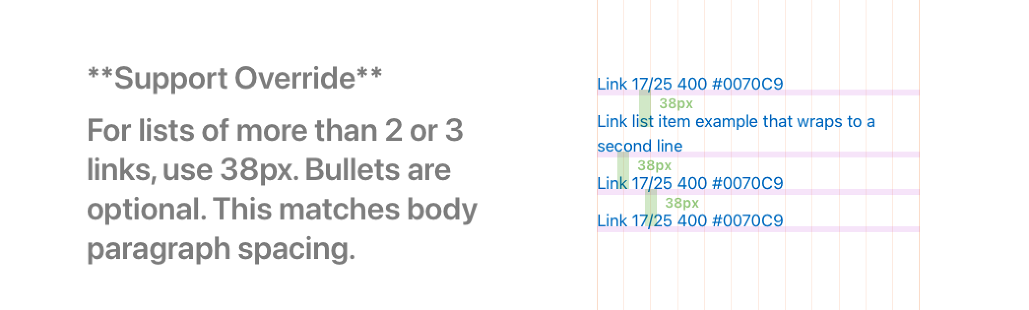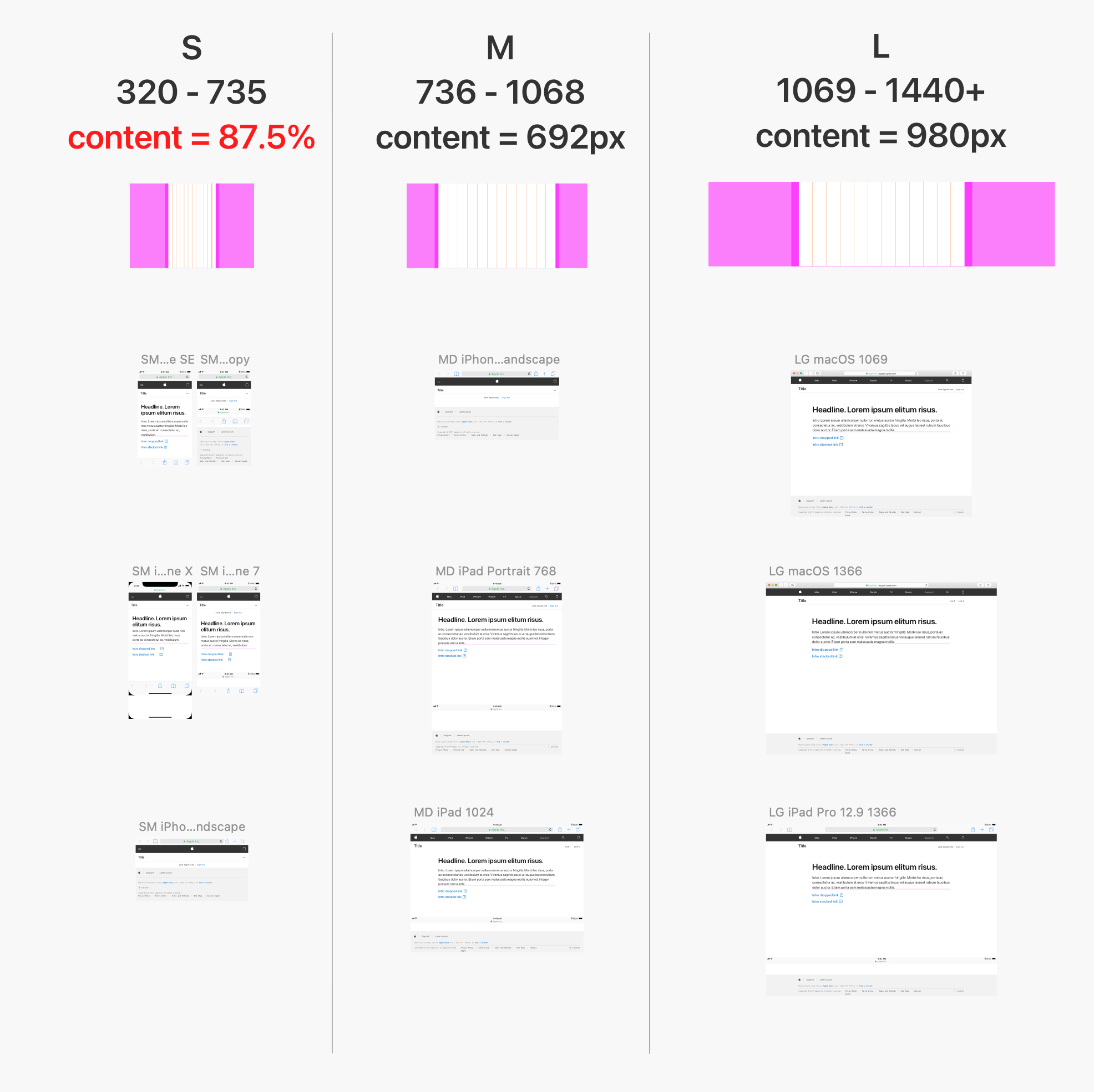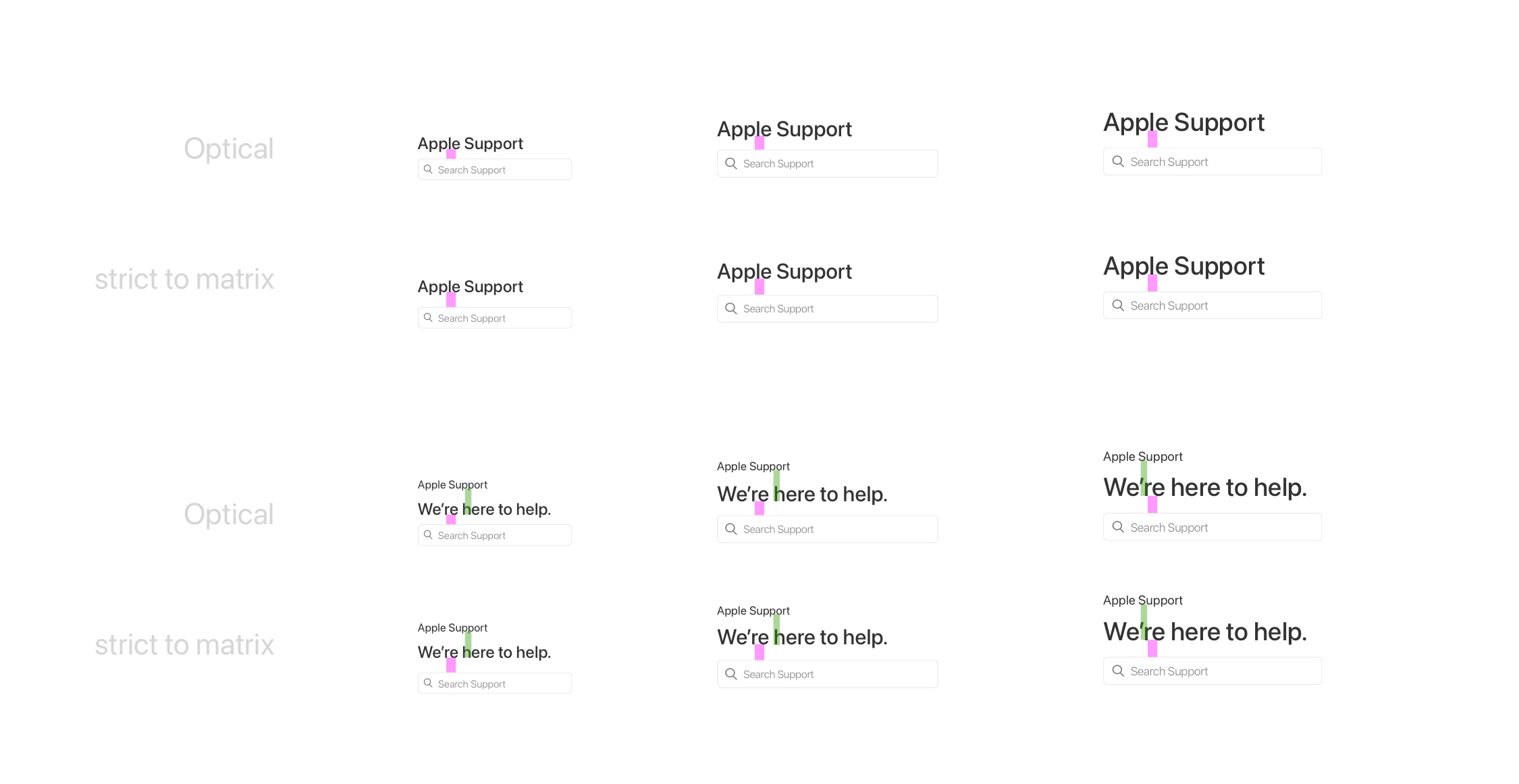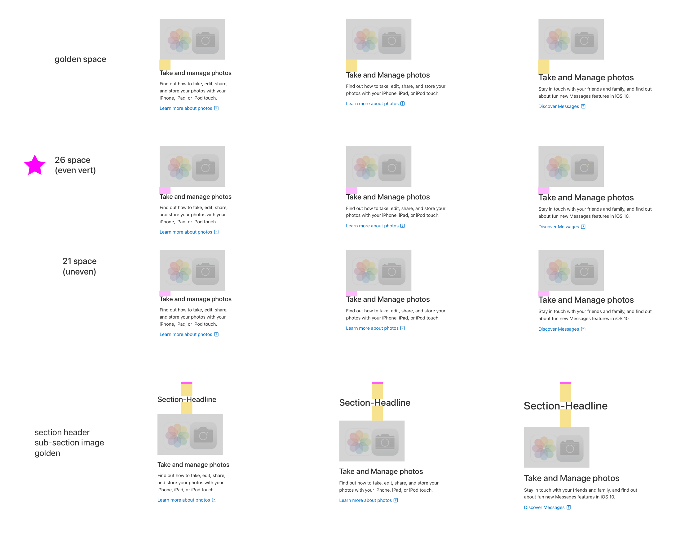 Reference docs with guidance for our Support use cases. My goal was to standardize how we spaced and spec’d mockups, so engineering could confidently begin to use shared components across AppleCare projects.