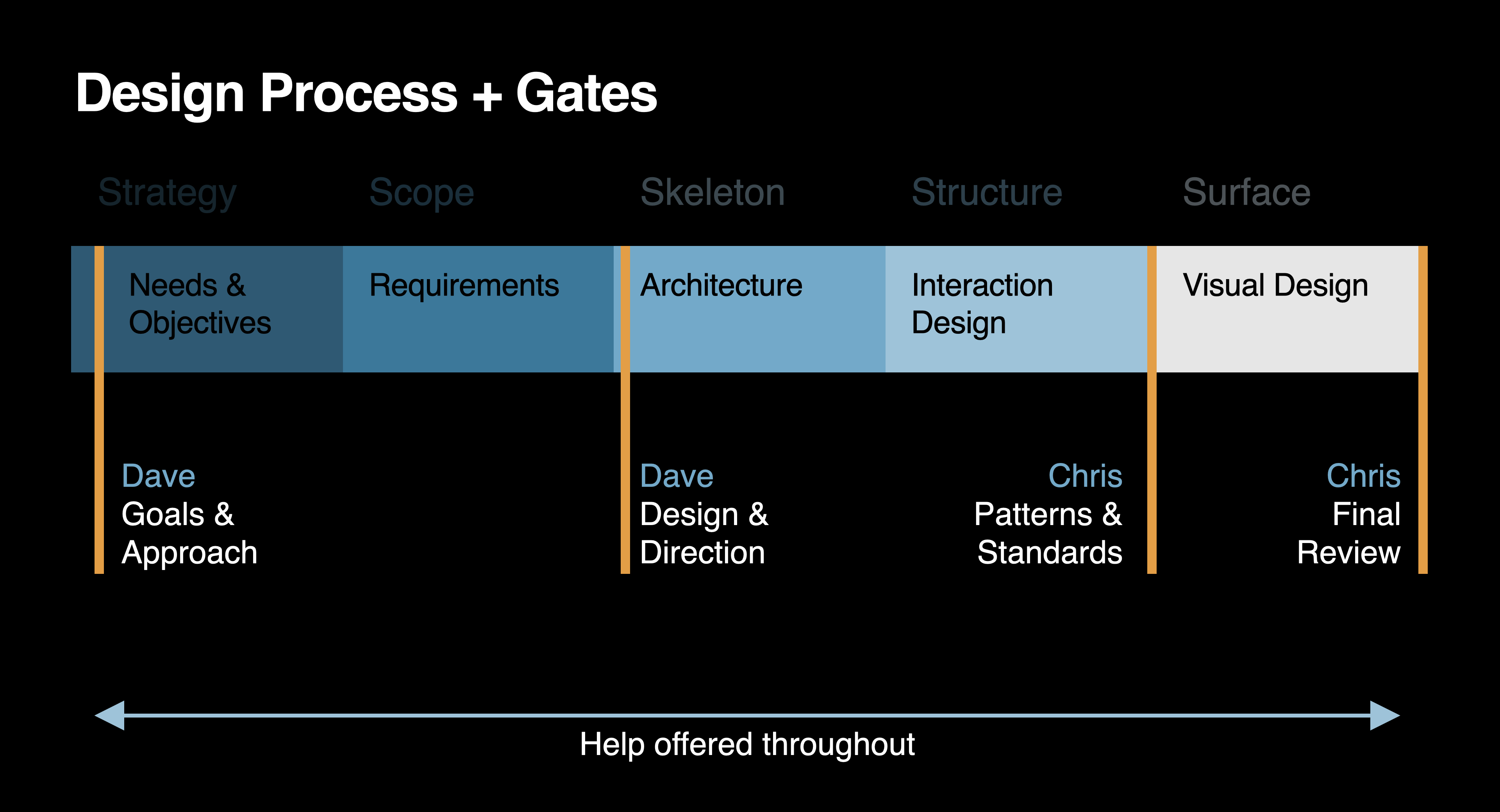 We introduced gate reviews to keep work on track. The creative director (CD) administered the strategic gates, and I administered the standards gates.