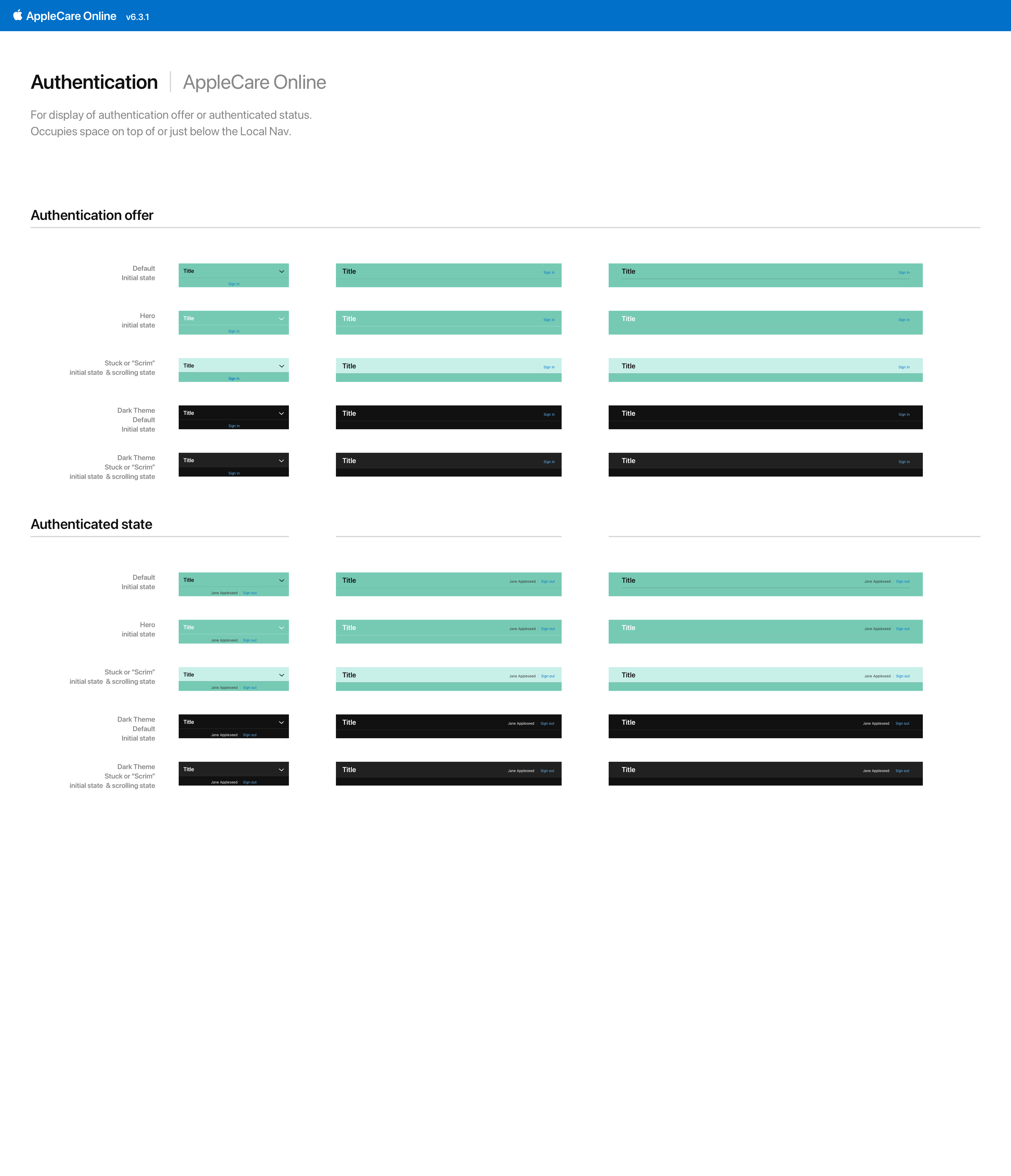 When a shared need arose without an existing solution, I designed a new component and added it to our design kit. For example, this Support-specific local navigation component provides a unified way to display authentication status across applications.