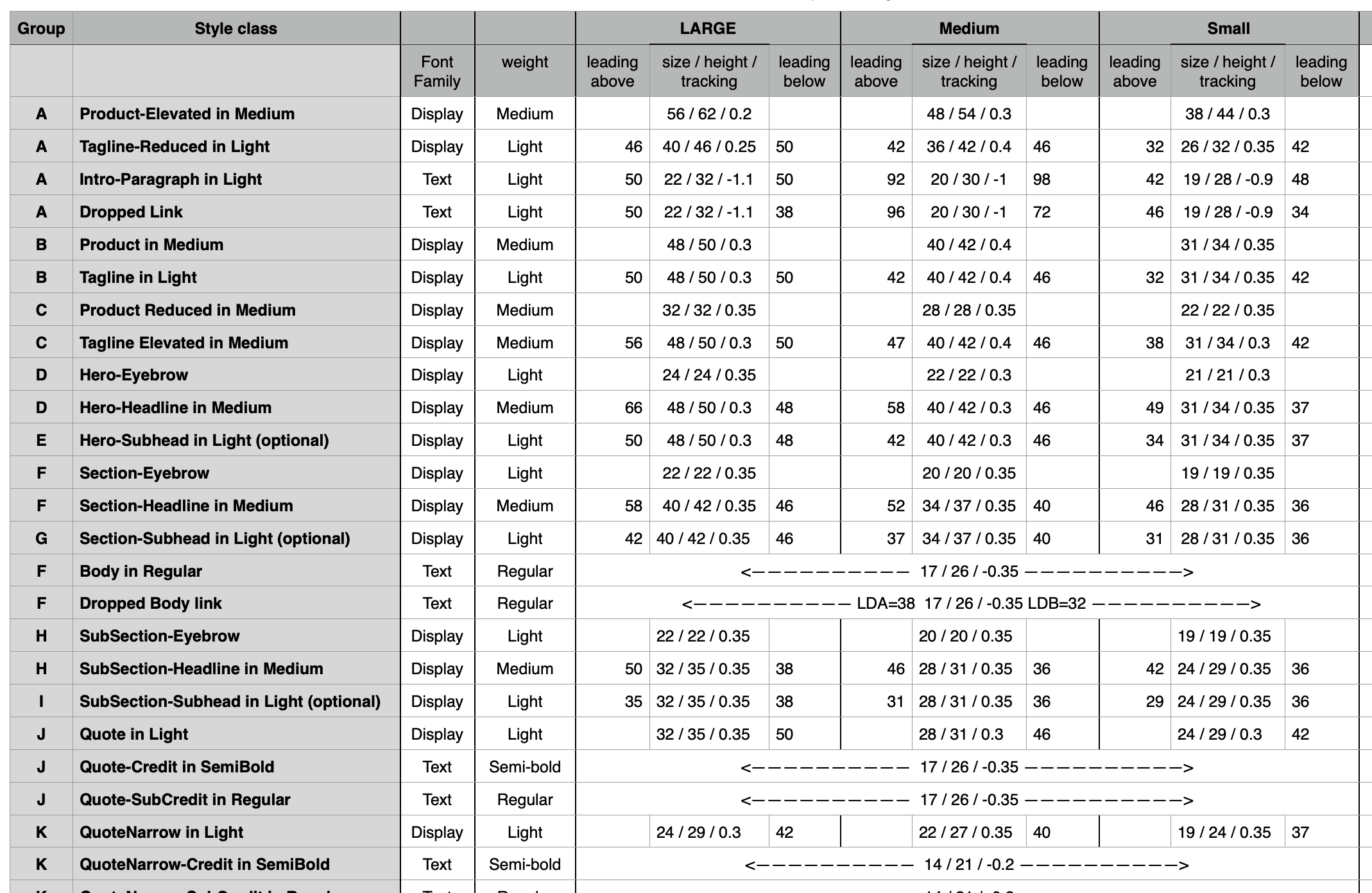 To better understand the logic behind sizing and spacing across breakpoints, I created a detailed analysis of the typographic styles.